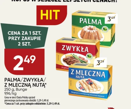 PALMA/ZWYKŁA/ Z MLECZNĄ NUTĄ* 250 g, Bunge 9,96/kg Cena w sieci Chata Polska sprzed pierwszego zastosowania obniżki: 3,29-3,49 zł. *Cena za 1 szt. przy zakupie oddzielnie: 3,29-3,49 zł.