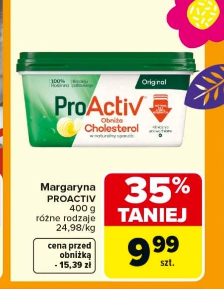 Margarina PROACTIV w Carrefour dostępna jest teraz za jedyne 9,99 zł za opakowanie 400 g. Obecnie możesz zaoszczędzić aż 35% w porównaniu do ceny regularnej 15,39 zł, co przekłada się na wyjątkową ofertę 24,98 zł za kilogram. Wybierz spośród różnych rodzajów i wykorzystaj tę margarynę do codziennego pieczenia lub smarowania pieczywa. Promocja obowiązuje w Carrefour i pozwala na zakup wysokiej jakości margaryny w bardzo atrakcyjnej cenie.