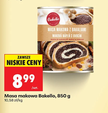Masa makowa Bakello w Biedronce kosztuje 8,99 zł za opakowanie o gramaturze 850 g. Cena za kilogram to 10,58 zł. Aktualnie w Biedronce obowiązuje promocja na ten produkt. Dodaj masę makową Bakello do swojej listy zakupów i sprawdź inne oferty w gazetkach promocyjnych.