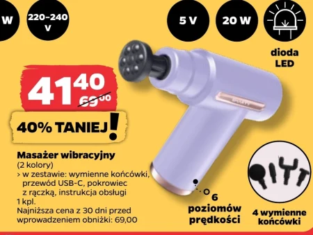Masażer wibracyjny występuje w ofercie Netto w cenie 41,40 zł, po obniżce z 69,00 zł, co oznacza 40% taniej. W zestawie znajdują się wymienne końcówki, przewód USB-C, pokrowiec z rączką oraz instrukcja obsługi. Ten kompaktowy masażer z sześcioma poziomami prędkości i czterema wymiennymi końcówkami pozwoli na relaks i odprężenie w domu, docierając do różnych grup mięśniowych. To doskonała okazja, by zadbać o swoje samopoczucie w atrakcyjnej cenie. Oferta ważna od 2026-04-09 do 2026-05-15 Źródło: gazetka Netto