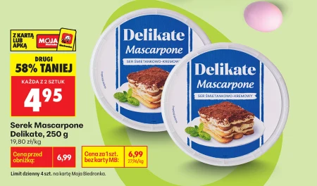 Serek Mascarpone Delikate, 250 g 19,80 zł/kg DRUGI 58% TANIEJ KAŻDA Z 2 SZTUK 4,95 Cena przed obniżką: 6,99