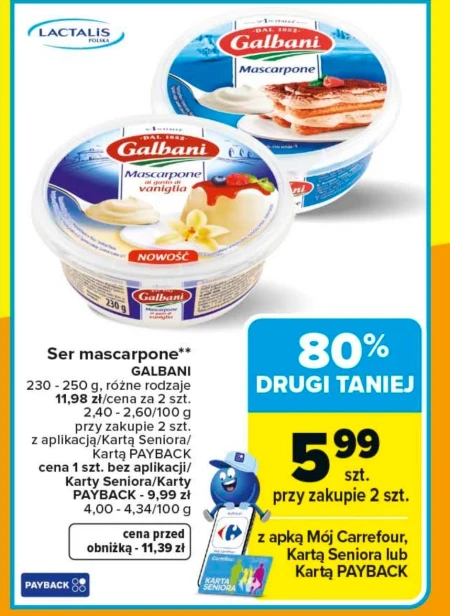 Ser mascarpone Galbani dostępny jest w Carrefourze w cenie 5,99 zł za sztukę przy zakupie dwóch opakowań o gramaturze 230-250 g, korzystając z aplikacji Mój Carrefour, Karty Seniora lub Karty PAYBACK. Cena regularna za pojedyncze opakowanie to 9,99 zł, a cena za 2 sztuki bez posiadania wymienionych kart wynosi 11,98 zł – co oznacza 80% zniżki od ceny przed obniżką wynoszącej 11,39 zł. Ten kremowy ser idealnie sprawdzi się do przygotowania tiramisu, deserów lub jako dodatek do słodkich i wytrawnych potraw. Cena jednostkowa w promocji to 2,40-2,60 zł/100 g.