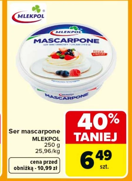 Ser mascarpone MLEKPOL dostępny jest w Carrefourze w cenie 6,49 zł za opakowanie 250 g, co daje 25,96 zł za kilogram. Aktualnie możesz zaoszczędzić 40% w porównaniu do ceny regularnej 10,99 zł – to znaczna obniżka. Delikatny i kremowy, idealnie sprawdzi się do przygotowania tiramisu lub słodkich deserów. Promocja w Carrefourze pozwala zaopatrzyć się w ten wysokiej jakości ser w wyjątkowo korzystnej cenie.