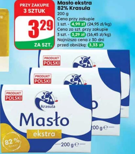 Masło ekstra 82% Krasula 200 g Cena przy zakupie 1 szt. - 4,99 zł (24,95 zł/kg) Cena za szt. przy zakupie 3 szt. - 3,29 zł (16,45 zł/kg) Najniższa cena z 30 dni przed obniżką: 3,33 zł