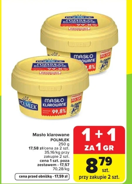 Masło klarowane Polmlek dostępne jest w ofercie Carrefour w cenie 17,58 zł za 2 sztuki, co daje 35,16 zł za kilogram. Cena pojedynczego opakowania poza zestawem to 17,57 zł, czyli 70,28 zł za kilogram, natomiast cena przed obniżką wynosiła 17,59 zł. Dzięki promocji 1 + 1 za 1 gr, zapłacisz jedynie 8,79 zł za sztukę przy zakupie dwóch opakowań. To wysokiej jakości masło klarowane, które dzięki procesowi klarowania ma wyjątkowy smak i aromat. Idealnie sprawdzi się w kuchni do smażenia, duszenia, a także jako dodatek do wypieków czy kanapek. To wyjątkowa okazja, aby zaopatrzyć się w ten produkt w atrakcyjnej cenie i cieszyć się jego unikalnymi walorami smakowymi.