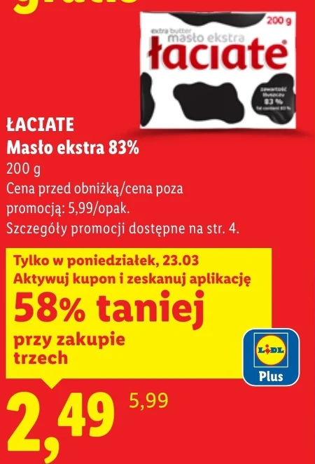 ŁACIATE Masło ekstra 83% w Lidlu kupisz teraz za 2,49 zł za opakowanie 200 g, zamiast 5,99 zł. Promocja 58% taniej obowiązuje tylko w poniedziałek, 23 marca, przy zakupie trzech opakowań po aktywacji kuponu w aplikacji. Masło idealnie sprawdzi się do smarowania pieczywa, pieczenia oraz gotowania. Szczegóły promocji znajdziesz na stronie 4 gazetki Lidla.