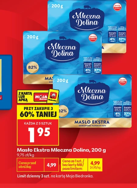Masło Ekstra Mleczna Dolina, dostępne w ofercie Biedronki, kosztuje 1,95 zł za 200 g opakowanie, przy zakupie trzech sztuk, co oznacza 60% obniżki ceny. To wysokiej jakości masło o zawartości tłuszczu 82%, idealne do smarowania pieczywa, przygotowywania potraw i wypieków. Produkt ten pochodzi z polskiego mleka i dostarcza energii, stanowiąc cenne źródło tłuszczu w diecie. Skorzystaj z wyjątkowej okazji i zaopatrz się w to pyszne masło w korzystnej cenie, pamiętając o limicie dziennym – trzy sztuki na kartę Moja Biedronka. Oferta ważna od 2026-04-29 do 2026-05-06 Źródło: gazetka Biedronka