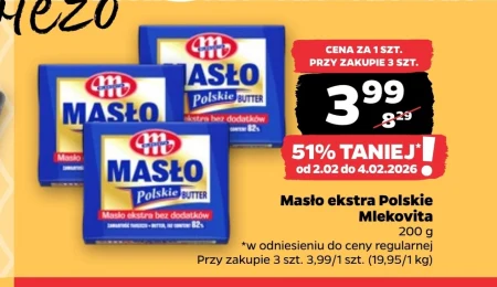 od 2.02 00 4.02.2026 1 Masło ekstra Polskie Mlekovita 200 g *w odniesieniu do ceny regularnej Przy zakupie 3 szt. 3,99/1 szt. (19,95/1 kg)