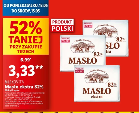 MLEKOVITA Masło ekstra 82% 200 g/1 opak. * cena przed obniżką/cena poza promocją: 6,99 zł/1 opak. (3,50 zł/100 g) ** cena za 1 opak. przy zakupie 3 opak .: 3,33 zł/1 opak. (1,67 zł/100 g) Limit: 6 opak. na paragon. Każde kolejne opakowanie będzie sprzedawane w cenie poza promocją.