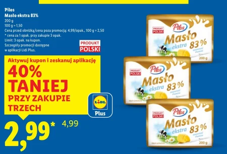 Pilos Masło ekstra 83% 200 g 100 g = 1,50 Cena przed obniżką/cena poza promocją: 4,99/opak., 100 g = 2,50 * cena za 1 opak. przy zakupie 3 opak. Limit: 3 opak. na kupon. Szczegóły promocji dostępne w aplikacji Lidl Plus.