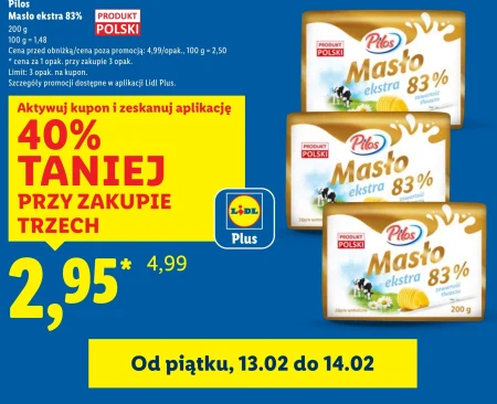 Pilos Masło ekstra 83% 200 g 100 g = 1,48 100 9 - 1,10 Cena przed obniżką/cena poza promocją: 4,99/opak., 100 g = 2,50 * cena za 1 opak. przy zakupie 3 opak. Limit: 3 opak. na kupon. Szczegóły promocji dostępne w aplikacji Lidl Plus.