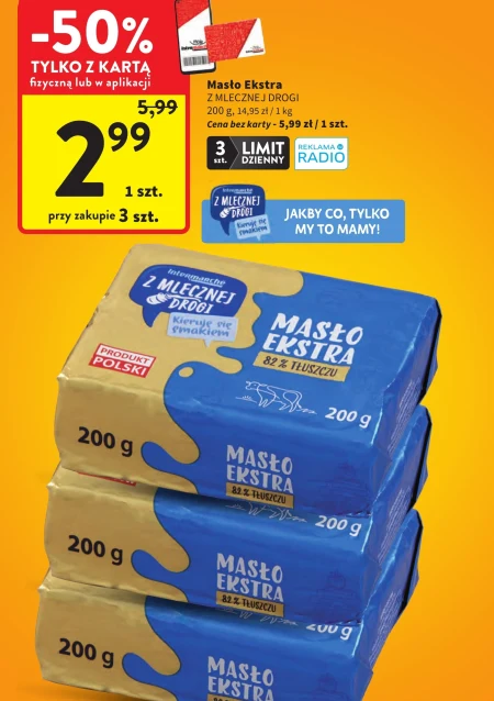 Masło Ekstra Z MLECZNEJ DROGI 200 g, 14,95 zł / 1 kg Cena bez karty - 5,99 zł / 1 szt. Naturalne masło ekstra o wysokiej zawartości tłuszczu mlecznego doskonale sprawdzi się do smarowania świeżego pieczywa, wypieków domowych oraz przygotowywania kremów i ciast. Idealne do smażenia, gotowania i pieczenia, podkreśla smak potraw, nadaje im kremową konsystencję i stanowi niezastąpiony składnik w każdej kuchni.