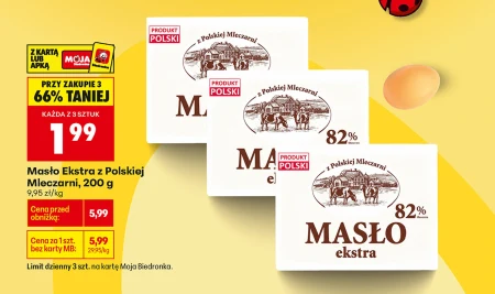 Masło Ekstra z Polskiej Mleczarni dostępne jest w ofercie Biedronka w cenie 9,95 zł za kilogram, a opakowanie 200 g można kupić już za 1,99 zł przy zakupie trzech sztuk z kartą Moja Biedronka lub w aplikacji, co stanowi aż 66% zniżki względem ceny regularnej 5,99 zł. To wysokiej jakości masło idealnie sprawdzi się do smarowania pieczywa, przygotowywania wypieków oraz jako dodatek do dań, nadając im wyjątkowy smak i aromat. Warto skorzystać z tej okazji, ponieważ limit dzienny to trzy sztuki na kartę, co pozwoli zaopatrzyć się w zapas na dłużej.