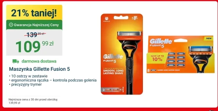 Maszynka Gillette Fusion 5 · 10 ostrzy w zestawie · ergonomiczna rączka - kontrola podczas golenia · precyzyjny trymer Najniższa cena z 30 dni przed obniżką: 139,99 zł