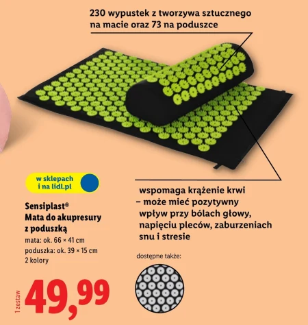 Sensiplast® Mata do akupresury z poduszką mata: ok. 66 x 41 cm poduszka: ok. 39 x 15 cm 2 kolory wspomaga krążenie krwi - może mieć pozytywny wpływ przy bólach głowy, napięciu pleców, zaburzeniach snu i stresie