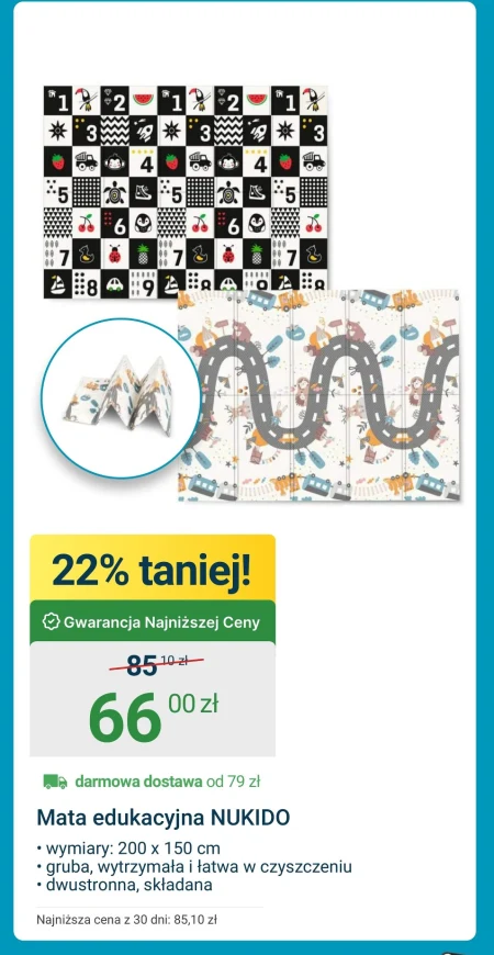 Mata edukacyjna NUKIDO • wymiary: 200 x 150 cm • gruba, wytrzymała i łatwa w czyszczeniu • dwustronna, składana Najniższa cena z 30 dni: 85,10 zł