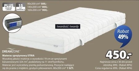 Materac sprężynowy STRIA Wysokiej jakości materac o wysokości 19 cm ze sprężynami kieszeniowymi 324 /m2, podzielony na 11 stref komfortu. Materac jest wyściełany pianką poliuretanową. Poszycie nadające się do prania z miękkim, grubym pikowaniem. 80x200 cm* 1 SZT.