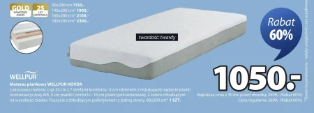 Materac piankowy WELLPUR HOVDA Luksusowy materac o gr.24 cm z 7 strefami komfortu i 4 cm rdzeniem z redukującej napięcie pianki termoelastycznej AIR, 4 cm pianki Comfort+ i 16 cm pianki poliuretanowej. Z żelem chłodzącym na wysokości bioder. Poszycie z chłodzącym polietylenem z jednej strony. 80x200 cm" 1 SZT.