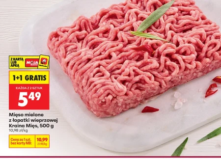 Mięso mielone z łopatki wieprzowej Kraina Mięs, 500 g 10,98 zł/kg Świeże mięso mielone z łopatki wieprzowej sprawdzi się idealnie do przygotowania soczystych kotletów mielonych, pulpetów w sosie pomidorowym czy aromatycznego sosu bolognese. Domowe burgery, nadzienie do pierogów lub tradycyjny farsz do gołąbków to kolejne pyszne propozycje, do których warto wykorzystać wysokiej jakości mielonkę wieprzową.