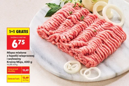 Mięso mielone z łopatki wieprzowej i wołowiny, 400 g, dostępne jest w ofercie Biedronka w cenie 6,75 zł za opakowanie, dzięki promocji 1+1 gratis. Doskonale sprawdzi się do przygotowania klasycznych kotletów, gulaszu, sosu bolońskiego czy zapiekanek. To okazja, żeby zaopatrzyć się w porządne mięso mielone w atrakcyjnej cenie i przygotować ulubione dania dla całej rodziny. Warto skorzystać z tej oferty, ponieważ cena za kilogram w promocji wynosi 16,88 zł. Oferta ważna od 2026-04-13 do 2026-04-18 Źródło: gazetka Biedronka