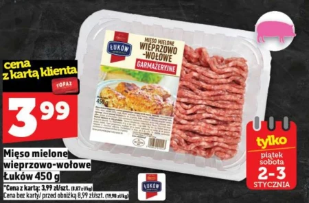 Mięso mielone wieprzowo-wołowe Łuków 450 g *Cena z kartą: 3,99 zł/szt. (8,87zł/kg) Cena bez karty/ przed obniżką 8,99 zł/szt. (19,98 zł/kg)