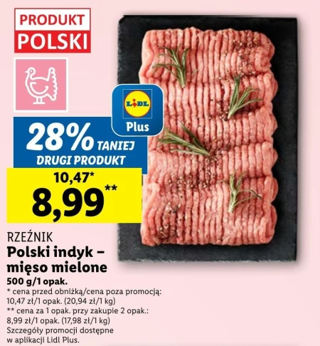 Polski indyk - mięso mielone 500 g/1 opak. * cena przed obniżką/cena poza promocją: 10,47 zł/1 opak. (20,94 zł/1 kg) ** cena za 1 opak. przy zakupie 2 opak .: 8,99 zł/1 opak. (17,98 zł/1 kg) Szczegóły promocji dostępne w aplikacji Lidl Plus.