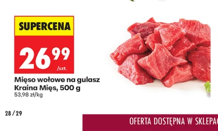 Mięso wołowe na gulasz Kraina Mięs, 500 g SUPERCENA 26,99 zł/szt. 53,98 zł/kg Kraina Mięs prezentuje wołowinę idealną na aromatyczny gulasz, teraz w wyjątkowej cenie. W najnowszej gazetce Biedronki znajdziesz ten wysokiej jakości produkt w promocyjnej ofercie – 500g mięsa za 26,99 zł. Przygotuj rozgrzewającą potrawę dla całej rodziny, a dzięki korzystnej cenie z Biedronki, nie obciążysz zbytnio domowego budżetu. To świetna okazja, by skosztować tradycyjnych smaków.