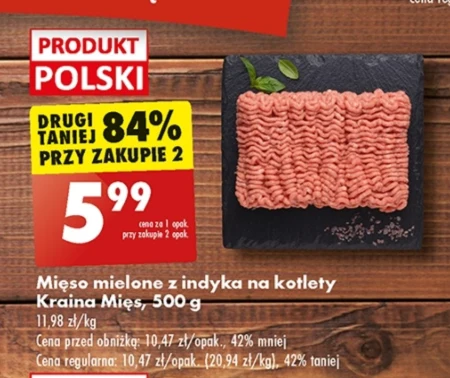 Mięso mielone z indyka na kotlety Kraina Mięs, 500 g 11,98 zł/kg Cena przed obniżką: 10,47 zł/opak., 42% mniej Cena regularna: 10,47 zł/opak. (20,94 zł/kg), 42% taniej