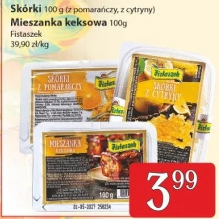 Skórki 100 g (z pomarańczy, z cytryny) Mieszanka keksowa 100g Fistaszek 39,90 zł/kg Skórki z pomarańczy i cytryny w zestawie to idealny składnik do wypieków, deserów i aromatyzowania napojów. W połączeniu z mieszanką keksową oraz fistaszkami, stanowią bazę do przygotowania pysznego, domowego keksa. Sprawdź pełną ofertę i inspiracje w najnowszej gazetce PSS Zamość, gdzie znajdziesz wszystko, czego potrzebujesz do stworzenia wyjątkowych smakołyków. Ten zestaw składników to propozycja dla miłośników ręcznie robionych słodkości.