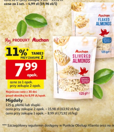 Migdały 125 g, płatki lub słupki cena przy zakupie 2 opak. – 15,98 zł (63,92 zł/kg) cena przy zakupie 1 opak. – 8,99 zł (71,92 zł/kg) Zdrowe przekąski, takie jak migdały, są doskonałym źródłem białka, witamin i minerałów, wspierając aktywny tryb życia i zdrową dietę. Te wyjątkowe orzechy, dostępne w formie płatków lub słupków, idealnie sprawdzą się jako dodatek do musli, jogurtów, wypieków, a także jako samodzielna, energetyczna przekąska dla osób dbających o sylwetkę. Wykorzystaj migdały w kuchni, by wzbogacić swoje posiłki w zdrowe tłuszcze i cenne składniki odżywcze, wspierające koncentrację i funkcje poznawcze.