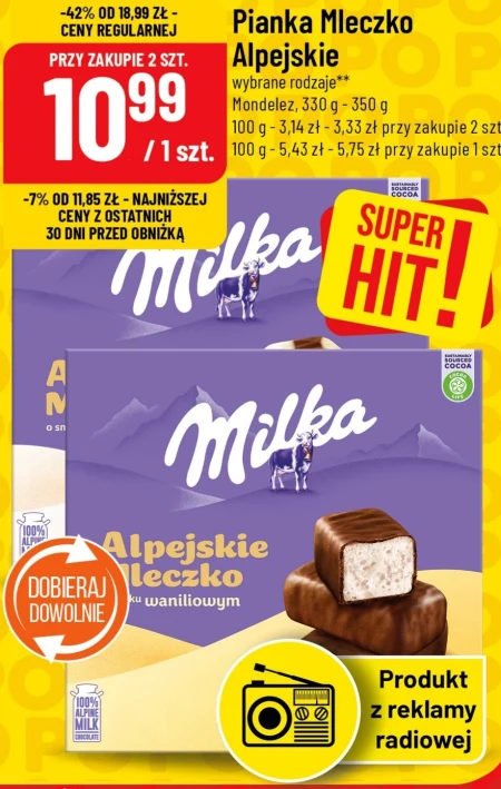 Pianka Mleczko Alpejskie wybrane rodzaje Mondelez, 330 g - 350 g