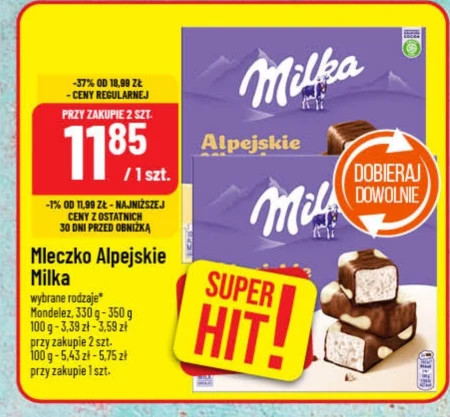 Mleczko Alpejskie Milka wybrane rodzaje* Mondelez, 330 g - 350 g 100 g - 3,39 zł - 3,59 zł przy zakupie 2 szt. 100 g - 5,43 zł - 5,75 zł przy zakupie 1 szt.
