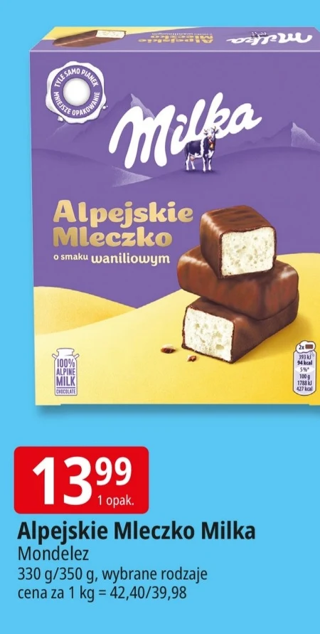 Alpejskie Mleczko Milka Mondelez 330 g/350 g, wybrane rodzaje cena za 1 kg = 42,40/39,98