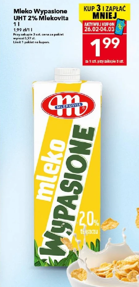 Mleko Wypasione UHT 2% Mlekovita 1l 1,99 zł/1 | Przy zakupie 3 szt. cena za pakiet wynosi 5,97 zł. Limit 1 pakiet na kupon.