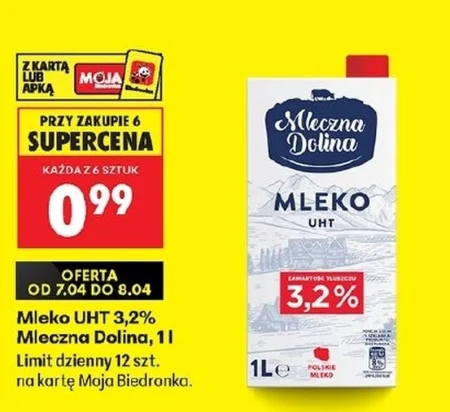 Mleko UHT 3,2% Mleczna Dolina o pojemności 1l kupisz w ofercie Biedronka w supercenie 0,99 zł przy zakupie 6 sztuk z kartą lub aplikacją Moja Biedronka. Ten produkt spożywczy to klasyczne mleko o standardowej zawartości tłuszczu, które sprawdzi się w codziennym spożyciu lub jako dodatek do napojów. Promocja obowiązuje od 7.04 do 8.04, a limit dzienny zakupów przypada na określoną liczbę sztuk na jedną kartę lojalnościową. Warto skorzystać z tej okazji, aby zrobić zapasy podstawowego produktu w niskiej cenie. Oferta ważna od 2026-04-07 do 2026-04-11 Źródło: gazetka Biedronka