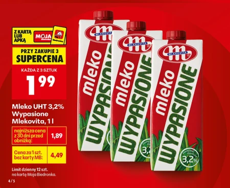 Mleko UHT 3,2% Wypasione Mlekovita, 1l Limit dzienny 12 szt. na kartę Moja Biedronka.