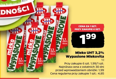 Mleko UHT 3,2% Wypasione Mlekovita 1l Przy zakupie 6 szt. 1,99/1 szt. Najniższa cena z ostatnich 30 dni przed wprowadzeniem obniżki: 1,99 Cena regularna przy zakupie 1 szt.: 4,85 Mleko UHT 3,2% Wypasione Mlekovita w opakowaniu 1l dostępne w Netto w promocyjnej cenie przy zakupie sześciu sztuk. To idealny wybór do codziennego użytku – zarówno do kawy, herbaty, jak i bezpośredniego spożycia, a także do przygotowania ulubionych potraw. Obecna oferta pozwala zaoszczędzić, a zapas mleka zawsze się przyda w domu.