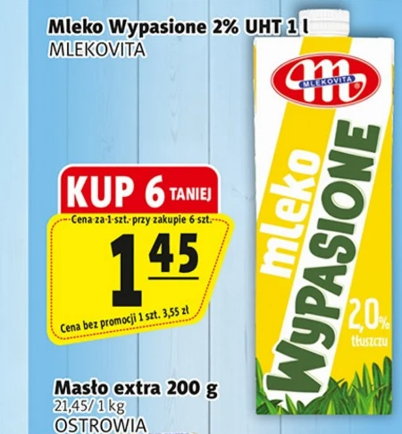 Mleko Wypasione 2% UHT 1 l marki MLEKOVITA kupisz w ofercie Prim Market w cenie 1,45 zł za sztukę przy zakupie sześciu opakowań, podczas gdy normalna cena to 3,55 zł. To naturalne mleko o obniżonej zawartości tłuszczu, idealne do picia, przygotowywania śniadań, kawy czy deserów. Warto skorzystać z tej okazji i zaopatrzyć się w ten podstawowy produkt spożywczy w korzystnej cenie. Masło extra 200 g od OSTROWIA dostępne jest za 21,45 zł za kilogram. To klasyczne masło o bogatym smaku, doskonałe do smarowania pieczywa, wykorzystania w kuchni oraz do przygotowywania ulubionych potraw. Oferta ważna od 2026-04-09 do 2026-04-15 Źródło: gazetka Prim Market