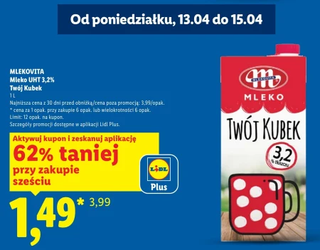 Mleko UHT 3,2% Twój Kubek 1 l jest dostępne w ofercie Lidl w cenie 1,49 zł, co oznacza aż 62% zniżki względem ceny 3,99 zł. To idealne mleko do codziennego użytku – sprawdzi się zarówno do kawy, herbaty, jak i do przygotowania ulubionych potraw. Produkt jest pakowany w wygodne, litrowe opakowanie, a dzięki kuponowi w aplikacji Lidl Plus można zaoszczędzić kupując minimum sześć sztuk, z limitem dwunastu opakowań na kupon. Skorzystaj z okazji i uzupełnij zapasy tym niezbędnym produktem w wyjątkowo korzystnej cenie. Oferta ważna od 2026-04-13 do 2026-04-15 Źródło: gazetka Lidl