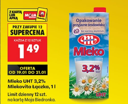 Mleko UHT 3,2% Mlekovita Łączka, 1l Limit dzienny 12 szt. na kartę Moja Biedronka.