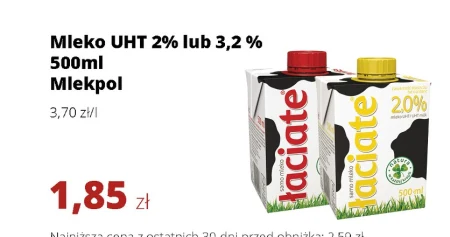 Mleko UHT 2% lub 3,2 % 500ml Mlekpol 3,70 zł/l