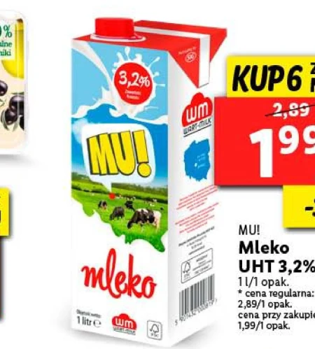 Mleko UHT 3, 2 %. Cena za jedno obowiązuje przy zakupie 6 opakowań.