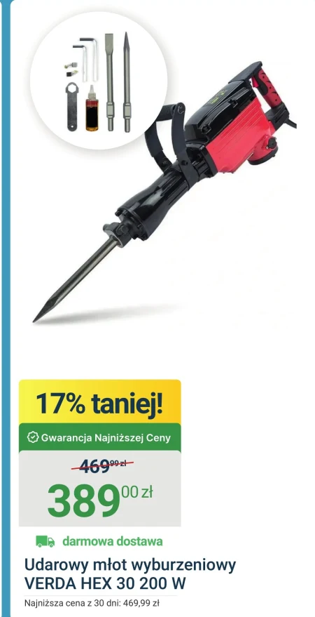 Udowy młot wyburzeniowy VERDA HEX 30 200 W jest dostępny w ofercie ERLI w cenie 389,00 zł, co oznacza 17% zniżki względem najniższej ceny z ostatnich 30 dni wynoszącej 469,99 zł. To wydajne narzędzie przeznaczone jest do efektywnego kucia i wyburzania, idealnie sprawdzi się podczas remontów i prac budowlanych. Zapewnia mocne i precyzyjne uderzenia, ułatwiając pracę z różnymi materiałami. Dodatkowo, zamówienie objęte jest darmową dostawą, a gwarancja Najniższej Ceny daje pewność najlepszej oferty. Oferta ważna od 2026-04-06 do 2026-04-12 Źródło: gazetka ERLI