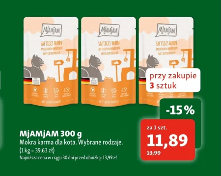 MJAMJAM 300 g mokrej karmy dla kota występuje w ofercie Maxi ZOO w cenie 11,89 zł, przy czym cena kilograma wynosi 39,63 zł. Aktualnie obowiązuje promocja – kupując trzy sztuki, zapłacisz 15% mniej niż standardowa cena 13,99 zł. Karma jest idealna dla kotów, zapewniając im smaczny i pełnowartościowy posiłek. To doskonała okazja, by zaopatrzyć się w ulubione danie Twojego pupila w atrakcyjnej cenie. Źródło: gazetka Maxi ZOO