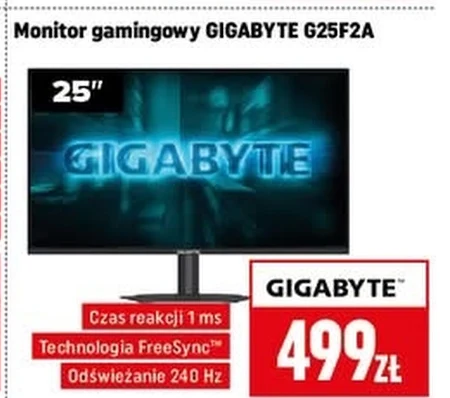 Monitor gamingowy GIGABYTE G25F2A 25" GIGABYTE Czas reakcji 1 ms Technologia FreeSync™ Odświeżanie 240 Hz 499,99 zł