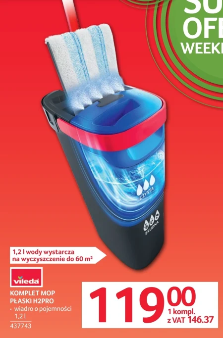 Komplet mop płaski H2Pro pozwala na efektywne czyszczenie powierzchni do 60 m² zaledwie 1,2 litra wody. W skład zestawu wchodzi mop oraz wadro o pojemności 1,2 litra, ułatwiające odciskanie wody. Aktualnie produkt dostępny jest w gazetce Abra w cenie 119,00 zł za komplet (146,37 zł z VAT). Sprawdzi się w każdym domu do szybkiego i dokładnego mycia podłóg.