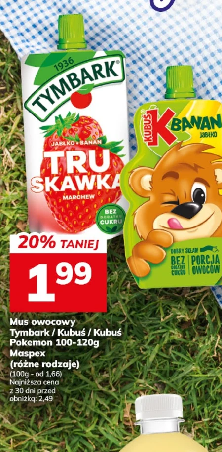Mus owocowy Tymbark, Kubuś lub Kubuś dostępny jest w ofercie Hitpol w cenie 1,99 za opakowanie o wadze 100-120g. To popularny i lubiany przez dzieci produkt, idealny jako szybka przekąska lub dodatek do drugiego śniadania. Wyjątkowo niska cena, po obniżce z 2,49, czyni z tej oferty okazję, której warto się przyjrzeć. Ten produkt Maspex występuje w różnych rodzajach, co zadowoli podniebienie nawet najbardziej wymagających konsumentów. Oferta ważna od 2026-04-10 do 2026-04-19 Źródło: gazetka Hitpol