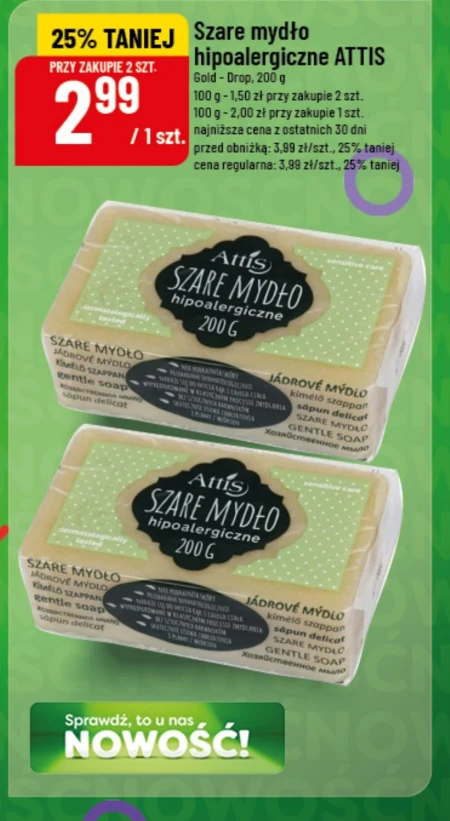 Szare mydło hipoalergiczne ATTIS Gold - Drop. 200 g 100 g - 1,50 zł przy zakupie 2 szt. 100 g - 2,00 zł przy zakupie 1 szt. najniższa cena z ostatnich 30 dni przed obniżką: 3,99 zł/szt., 25% taniej cena regularna: 3,99 zł/szt., 25% taniej