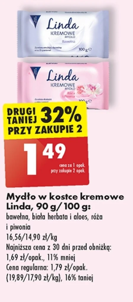 Mydło w kostce kremowe Linda, 90 g/100 g: bawełna, biała herbata i aloes, róża i piwonia 16,56/14,90 zł/kg Najniższa cena z 30 dni przed obniżką: 1,69 zł/opak., 11% mniej Cena regularna: 1,79 zł/opak. (19,89/17,90 zł/kg), 16% taniej