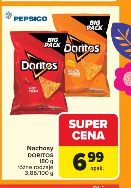 Doritos Nachosy w Carrefourze kosztują obecnie 6,99 zł za opakowanie 180 g, co daje cenę 3,88 zł za 100 g. Dostępne są różne rodzaje, więc możesz wybrać swój ulubiony smak. To idealna przekąska do oglądania filmu lub podczas spotkań ze znajomymi. Sprawdź gazetkę promocyjną Carrefour, aby nie przegapić tej oferty.